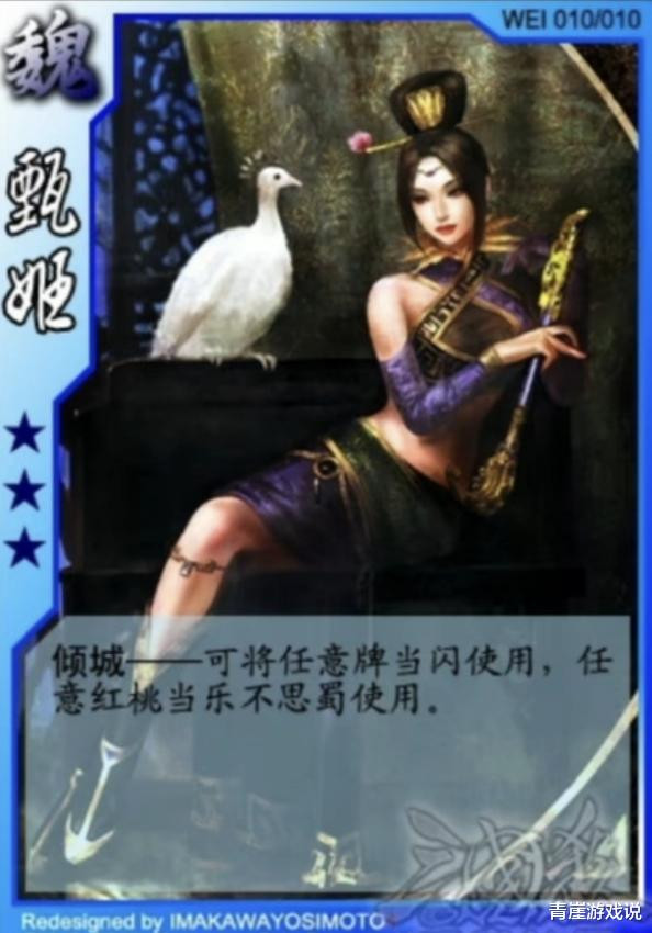 最初版本的甄姬只有【倾国】一个技能,效果有两个:任意牌当闪、任意红桃牌当乐不思蜀。甄姬的【倾国】比现在还强,而且缝合了大乔的【国色】。作为早期武将,防御能力强、控制能力强,甄姬实在是太无解了吧!