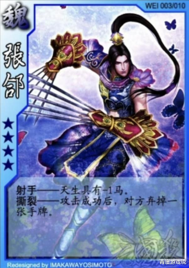 最初版本的张郃技能是【射手】,效果和【马术】完全相同。二技能【撕裂】则类似麒麟弓,只是将坐骑换成了手牌。张郃的强度一般,本质上就是两张装备牌的合体,这在早期的武将中是很常见的。
