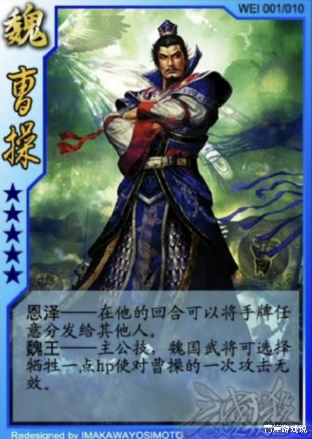 最初版本的曹操技能是【恩泽】,可将手牌分配给其他角色。这不就是刘备的【仁德】吗?原始版本的曹操没有后续效果,纯粹是一个辅助技能!【魏王】类似【护驾】,魏国角色可以掉血帮助曹操抗伤,是比较厉害的保护技能。